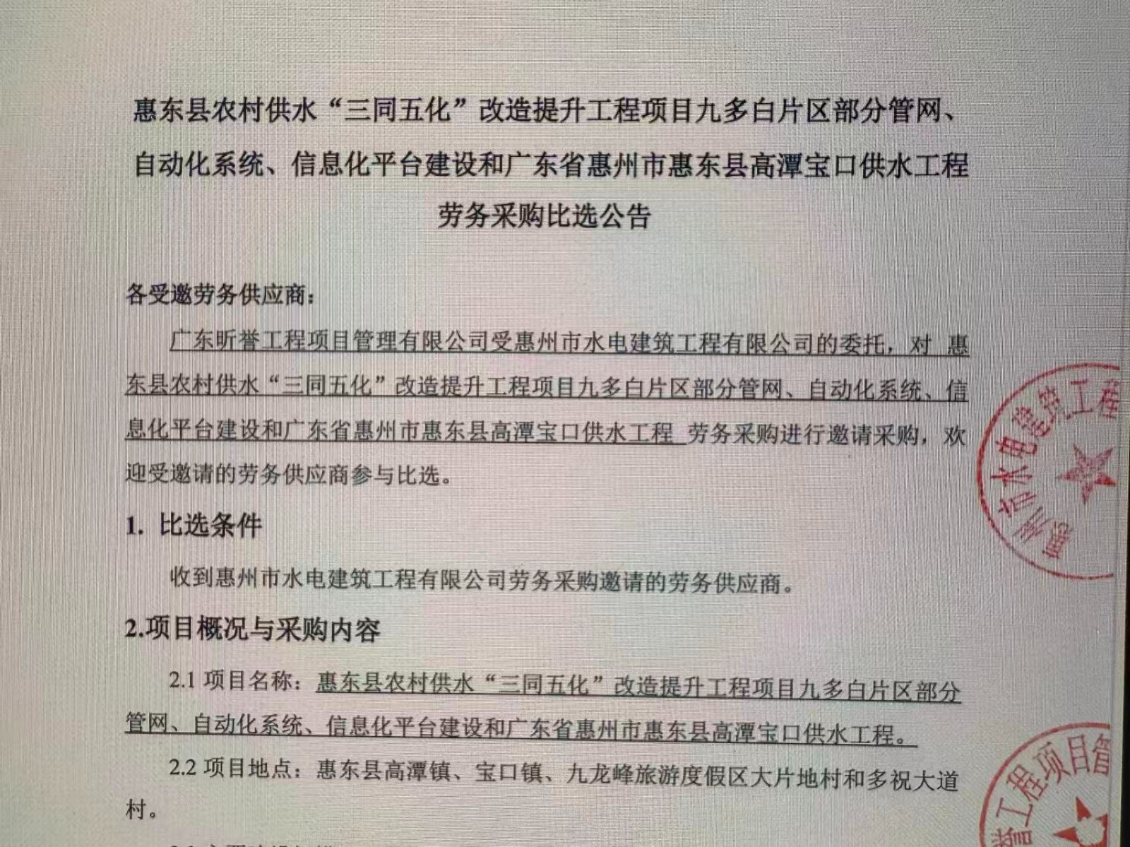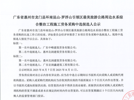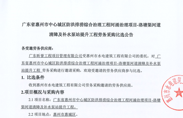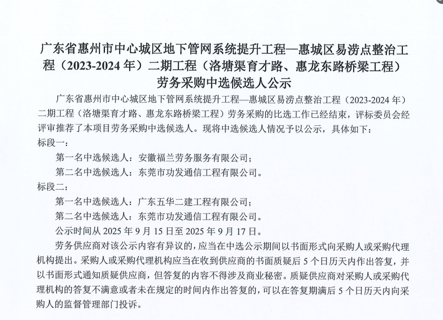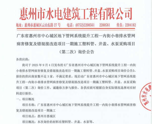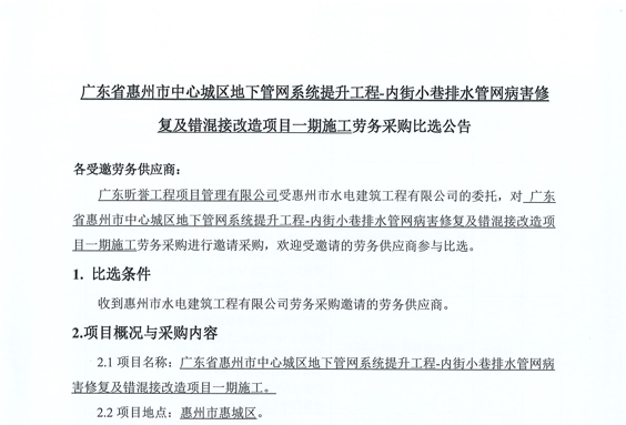 廣東省惠州市中心城區(qū)地下管網(wǎng)系統(tǒng)提升工程-內(nèi)街小巷排水管網(wǎng)病害修復(fù)及錯混接改造項目一期施工勞務(wù)采購比選公告……